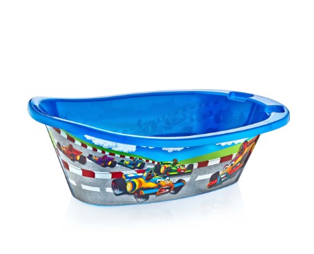 حوض الاستحمام البلاستيكي المعروض في الصورة هو منتج مخصص للأطفال، يتميز بتصميم مرح وجذاب برسومات سيارات سباق.