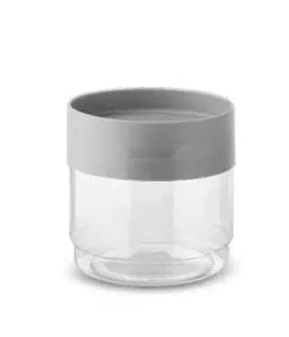 المنتج في الصورة هو برطمان ليجو ، وهو عبارة عن حاوية تخزين بلاستيكية شفافة بغطاء أسود محكم الإغلاق.