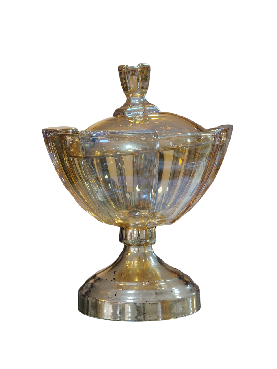 هذا وعاء زجاجي أنيق للحلويات، مزود بغطاء وقاعدة.
