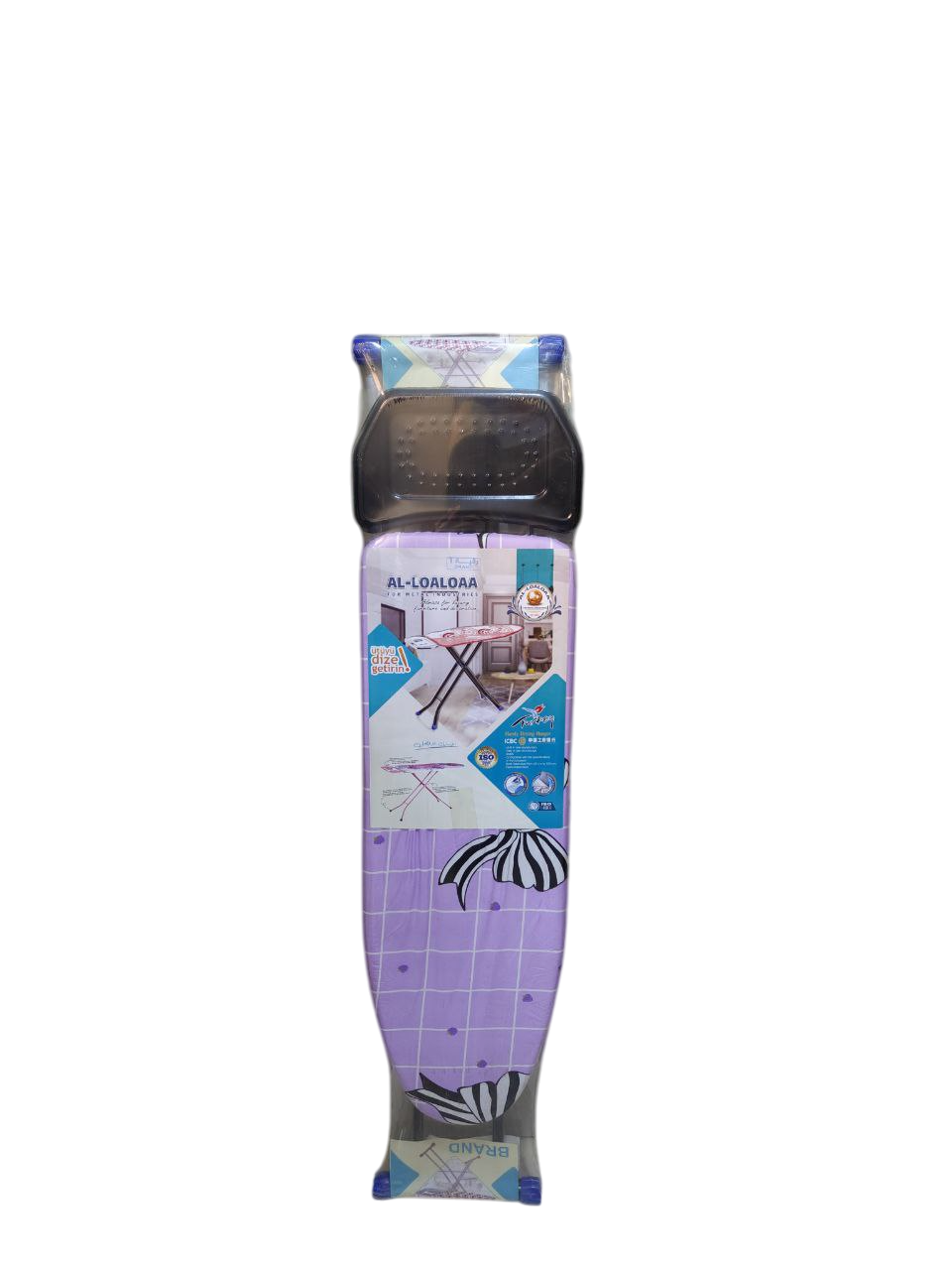 طاولة كيّ بغطاء منقوش. إنها طاولة كيّ قياسية قابلة للطي، مصنوعة على الأرجح من المعدن، ومصممة لتوفير المساحة وسهولة الحمل.