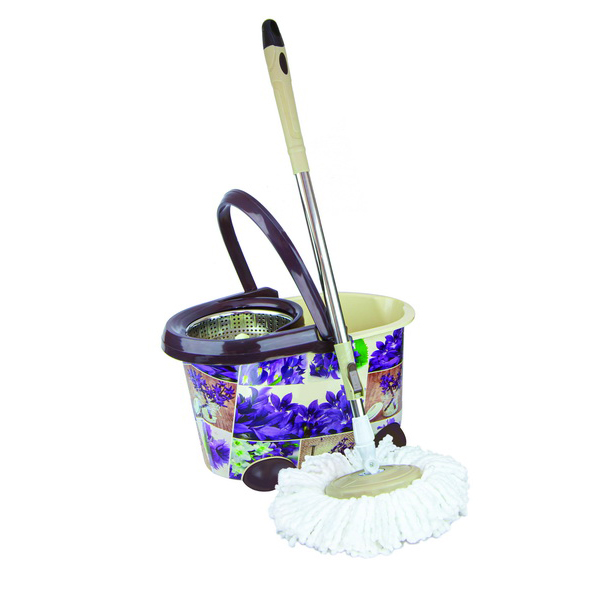 طقم ممسحة دوارة بزاوية 360 درجة مع دلو. يتميز الدلو بنقشة زهور أرجوانية مميزة، وعصارة بنية اللون، وعجلات لسهولة الحركة. صُمم الطقم للتنظيف بدون استخدام اليدين، حيث يمكنك غسل رأس الممسحة وعصره باستخدام آلية دوران يتم تفعيلها بالضغط اليدوي على المقبض.