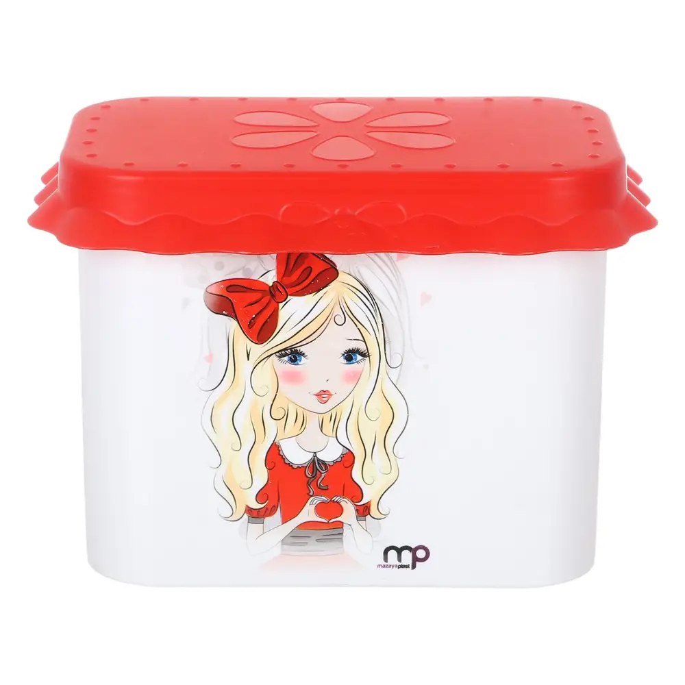 التصميم: تتميز العلبة بتصميم خاص مطبوع عليه رسم لفتاة بشعر أشقر وفستان أحمر، مما يجعلها مناسبة لغرف الأطفال أو لتخزين مستحضرات التجميل. يحتوي الغطاء على تصميم مزخرف على شكل فيونكة أو زهرة.