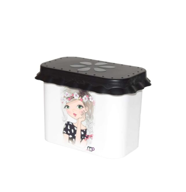 التصميم: يتميز برسومات طفولية لفتاة شقراء ترتدي فستانًا أسود منقطًا بالأبيض مع فيونكة، مما يجعله مناسبًا لغرف الأطفال أو للاستخدام المنزلي العام. يحتوي على غطاء أسود مزخرف يساعد على حفظ المحتويات آمنة.