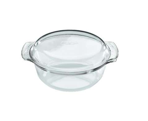 طاجن الفرن في الصورة هو طاجن كسرولة زجاجي دائري كلاسيكي بغطاء من بايركس (Pyrex Classic Round Covered Casserole). يتميز هذا الوعاء بتصميمه العملي المصنوع من زجاج البوروسيليكات المعروف بمتانته ومقاومته العالية للحرارة والصدمات الحرارية.