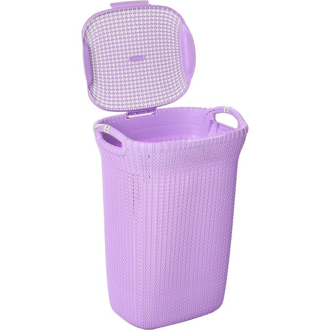 سلة غسيل باللون البنفسجي. سلة بلاستيكية متينة وعملية، مصممة لحفظ الملابس المتسخة، ويمكن استخدامها أيضًا لأغراض التخزين المنزلية العامة.