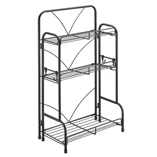 هذا رف تخزين معدني أسود بثلاث طبقات متعدد الاستخدامات، مصمم للمساعدة في تنظيم وترتيب المساحات المختلفة في المنزل، مثل المطبخ أو الحمام أو المكتب.