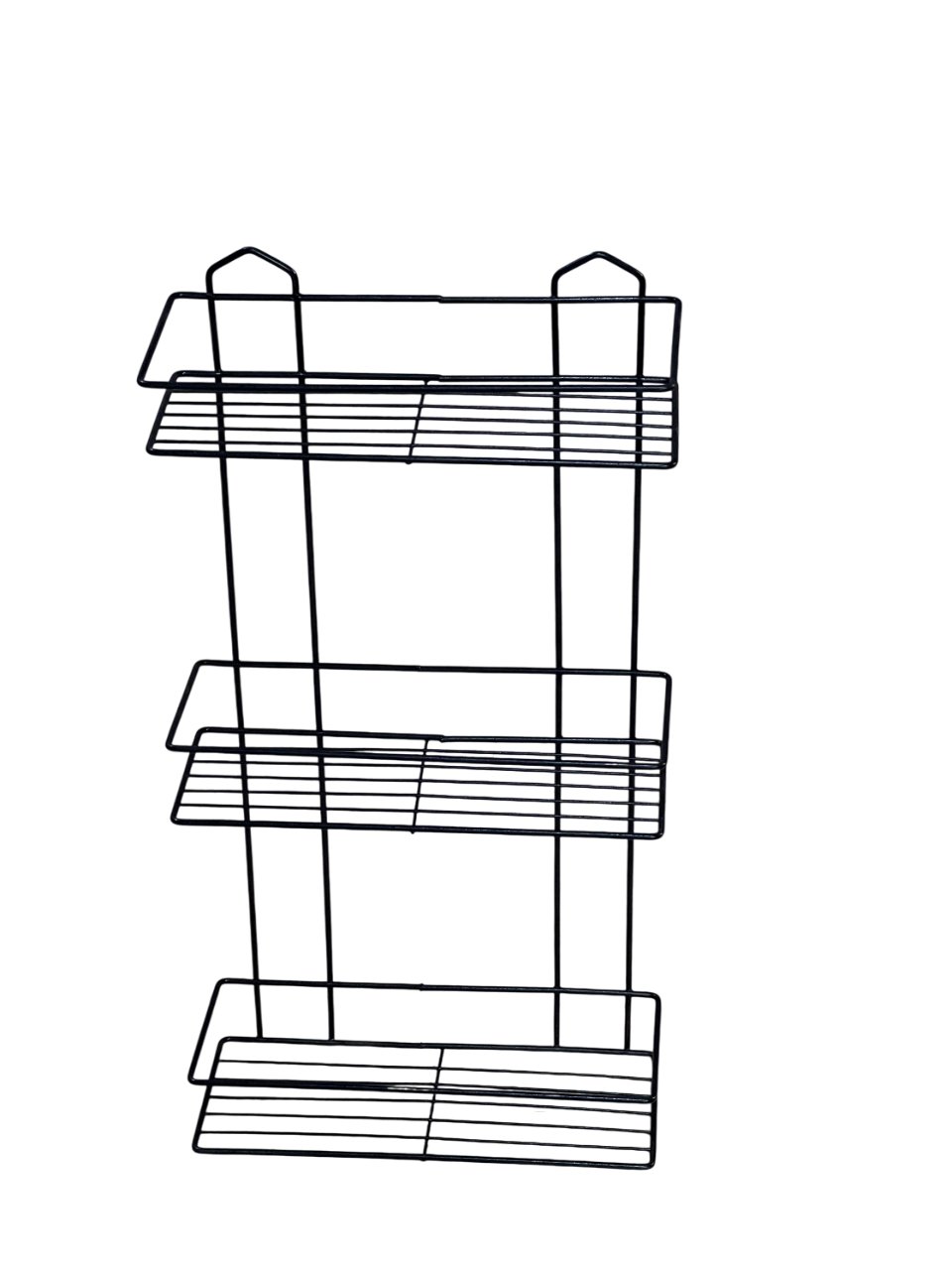 رف معدني ثلاثي الطبقات باللون الأسود. يُعرف هذا النوع من المنتجات عادةً باسم “رف حمام” أو “منظم حمام”، وهو مصمم لتوفير مساحة تخزين إضافية في الزوايا أو على الجدران في بيئات مثل الحمام أو المطبخ.