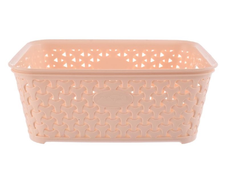 سلة تخزين بلاستيكية بنقش هندسي مزخرف (مثلث/مظهر منسوج). تُباع عادةً كمنظم متعدد الاستخدامات لمختلف الأدوات المنزلية.
