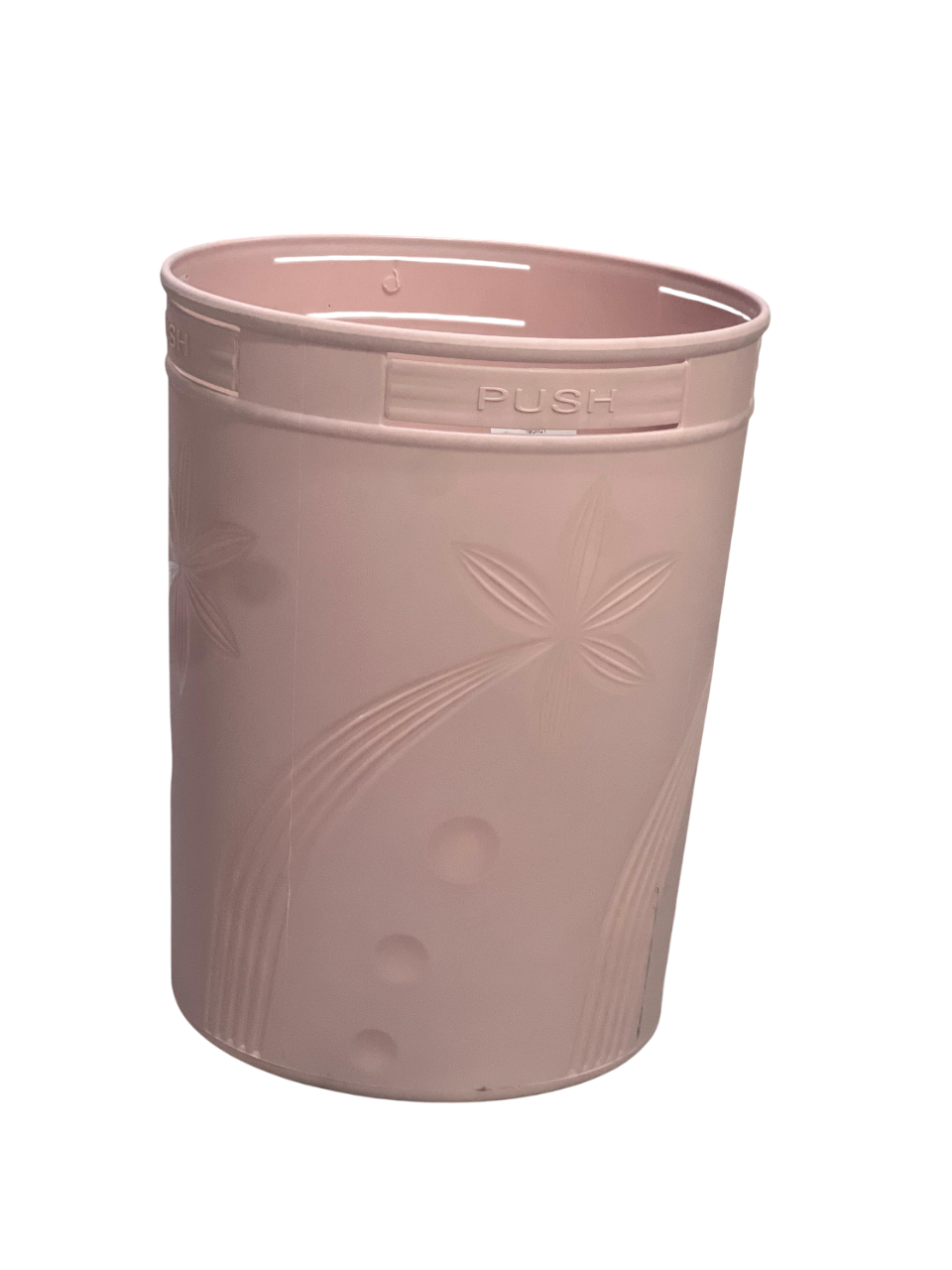 سلة مهملات بلاستيكية بلون وردي فاتح، تتميز بآلية فتح “PUSH” (دفع) مدمجة في الغطاء. يتميز التصميم بنقوش زخرفية على الجوانب تشبه أوراق أو زهور، مما يضيف لمسة جمالية للمنتج.