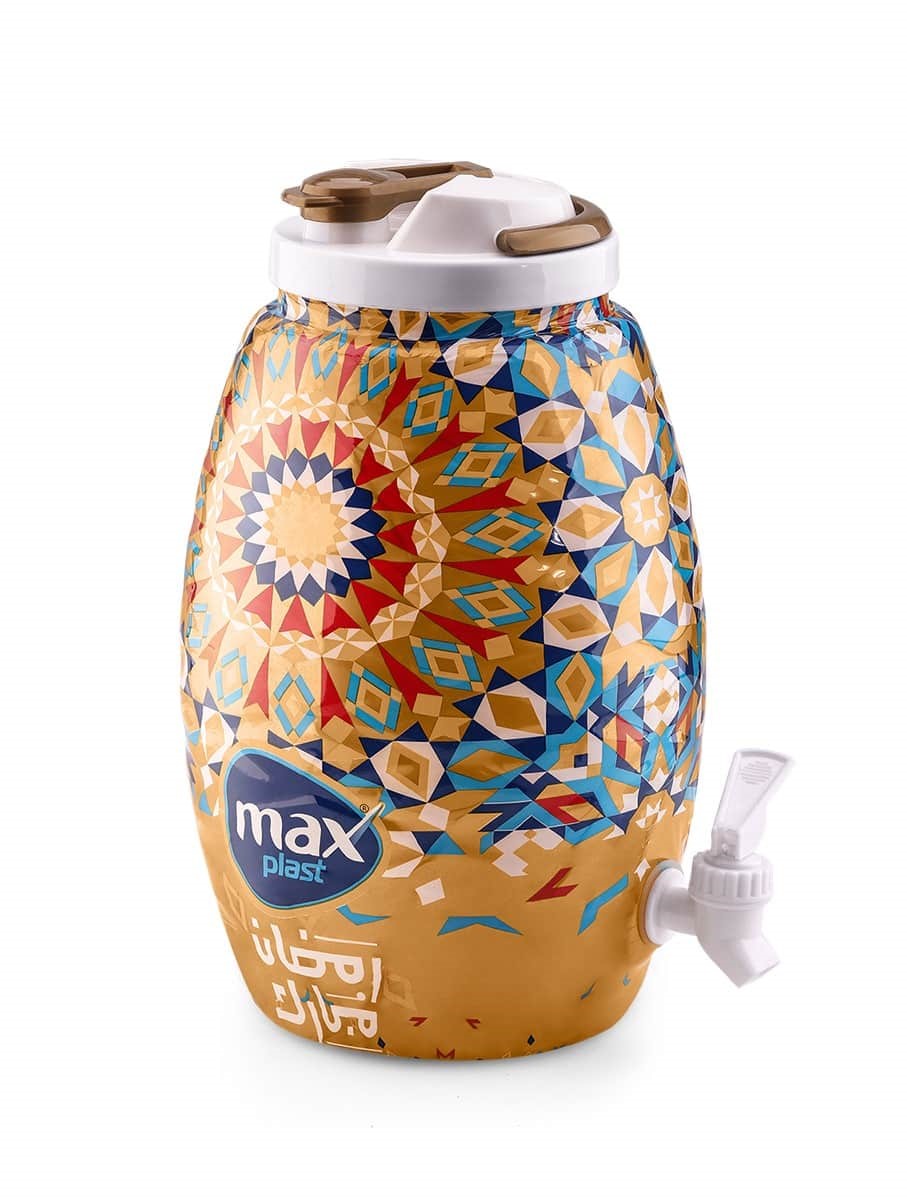 موزع المياه المعروض في الصورة هو ديسبنسر عصير رمضاني من إنتاج شركة Maxplast المصرية. يتميز بتصميم تقليدي مناسب لأجواء شهر رمضان المبارك، ومصمم خصيصًا لتقديم المشروبات الباردة مثل العصائر والمياه.