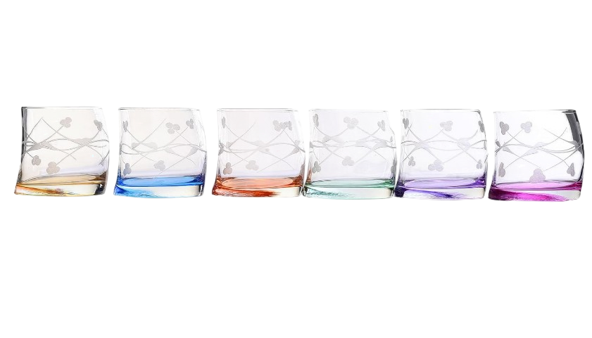 طقم من ستة أكواب شرب من طراز باشاباشي أولد فاشون، بقاعدة متعددة الألوان ونقوش بيضاء دقيقة محفورة. تتميز بشكلها الفريد وحافتها المنحنية قليلاً.