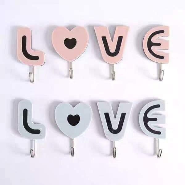 مجموعة من علاقات الحائط على شكل حروف كلمة “LOVE”، تتضمن علاقة لكل حرف من الأحرف: L، O (على شكل قلب)، V، وE. صُممت هذه العلاقات لتكون زينة ذاتية اللصق، مناسبة للاستخدام في المطابخ، الحمامات، غرف النوم، أو المداخل.