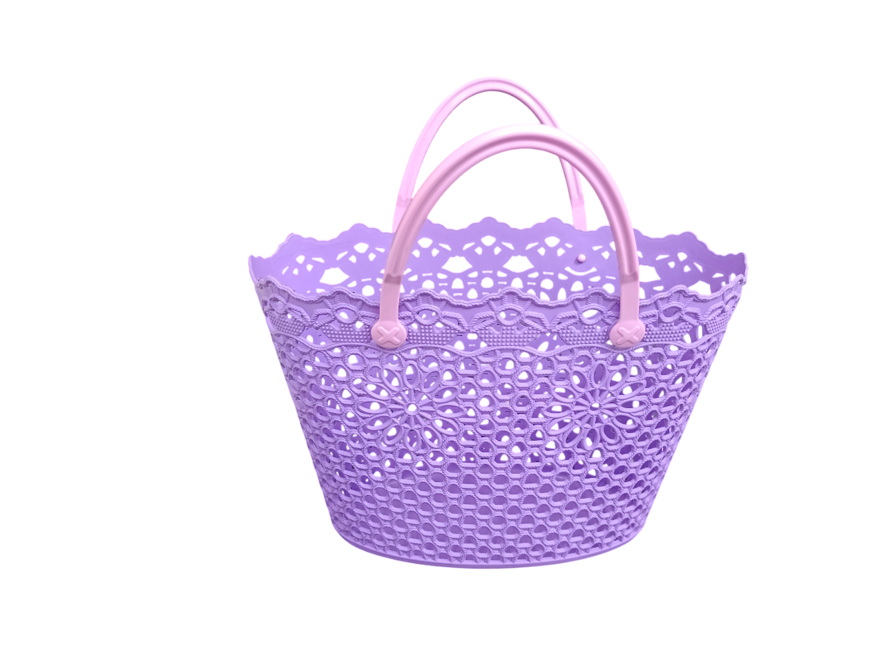السلة البلاستيكية المعروضة في الصورة هي سلة بتصميم دانتيل أو راتان مخرمة، وتستخدم لأغراض متعددة مثل لتخزين الملابس المتسخة، أو للتنظيم المنزلي.
