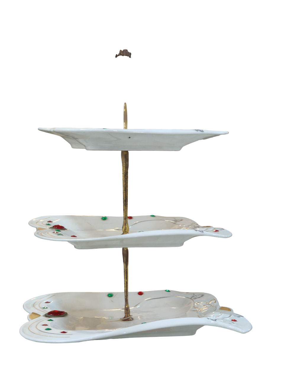 هذا المنتج عبارة عن شيالة تقديم/حامل كعك بثلاث طبقات ، بمقبض ذهبي وزينة احتفالية . تُستخدم هذه القطع عادةً لتقديم الكب كيك، والحلويات، والمقبلات، أو كقطعة مركزية أنيقة في حفلات الأعياد والمناسبات.