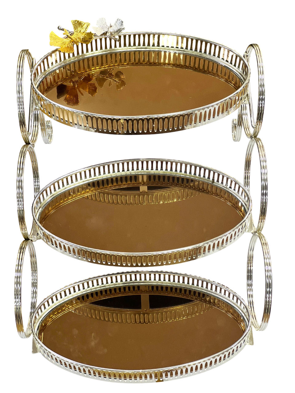الحامل المزخرف الظاهر في الصورة هو شيالة حلويات أو كحك ذات تصميم دائري ثلاثي الطبقات باللون الذهبي والفضي.