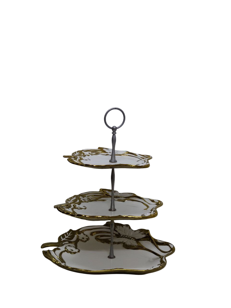 حامل تقديم ثلاثي الطبقات بأطباق على شكل أوراق شجر، ومقبض وتركيبات معدنية ذهبية أو فضية اللون. مصمم لتقديم الحلويات والفواكه والبسكويت.