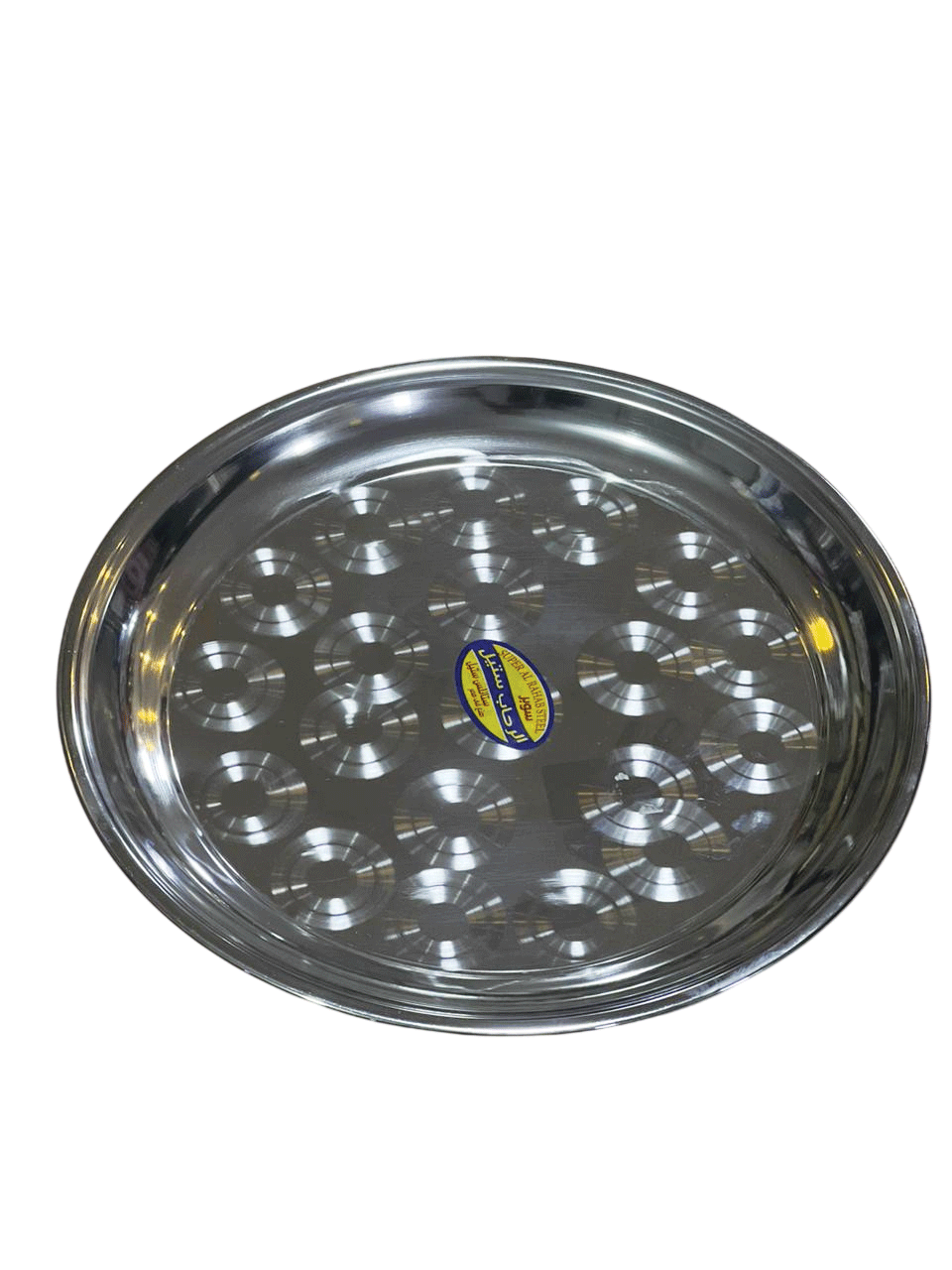 الصورة صينية تقديم دائرية من الفولاذ المقاوم للصدأ، تُعرف أيضًا باسم “صينية العشاء” أو “طبق العشاء” في مصر.