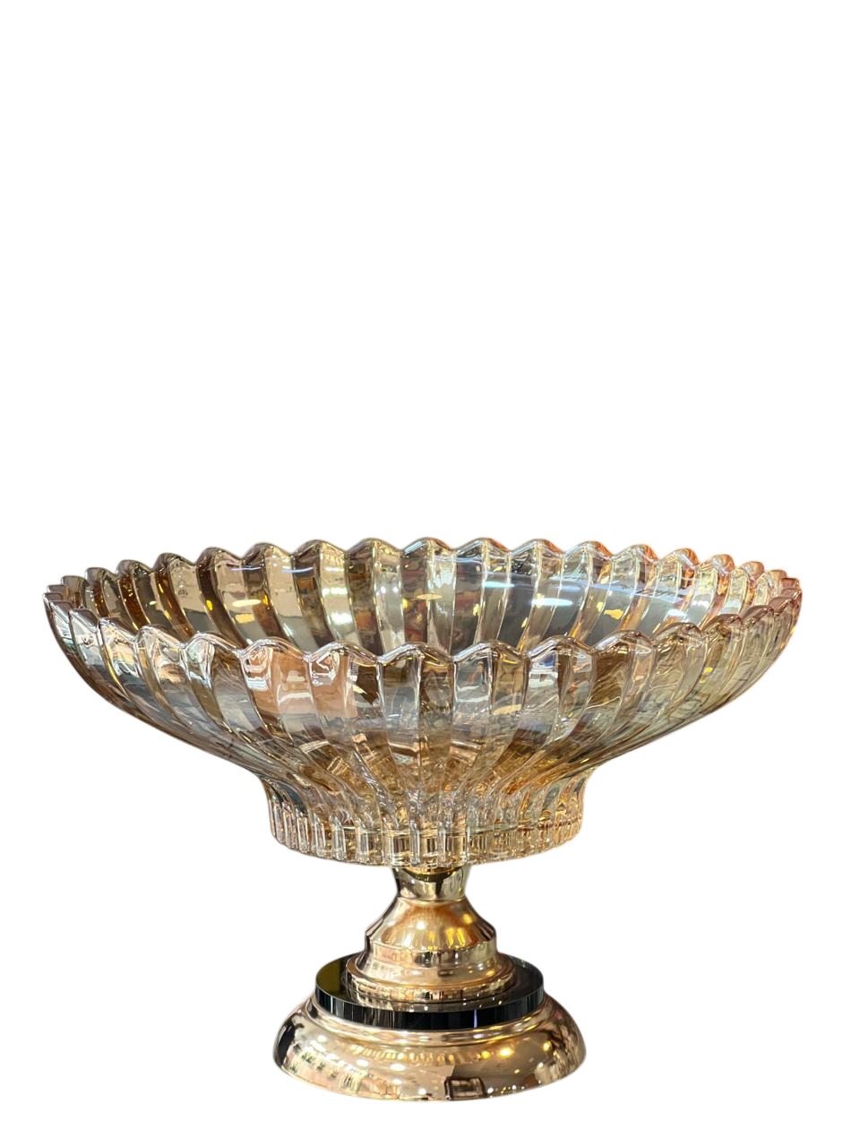 وعاء فاكهة زجاجي كريستالي مزخرف بقاعدة معدنية مطلية بالذهب. مصمم بأسلوب أوروبي عصري فاخر، ويُستخدم كقطعة مركزية على طاولات الطعام، أو في غرف المعيشة، أو لتقديم الفواكه والحلويات والوجبات الخفيفة.