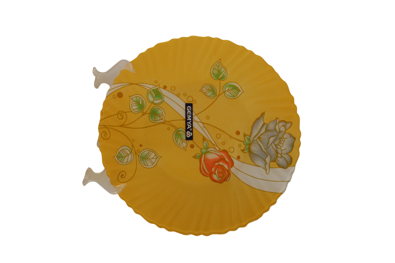 طبق عشاء بخلفية صفراء زاهية وتصميم زهري دقيق. يتميز بوردة كبيرة رمادية مائلة للبياض ووردة أصغر حمراء/برتقالية، مُكمّلة بأوراق خضراء ونقوش كروم أنيقة متداخلة. يتميز الطبق بحافة مُسننة ومُلتوية.