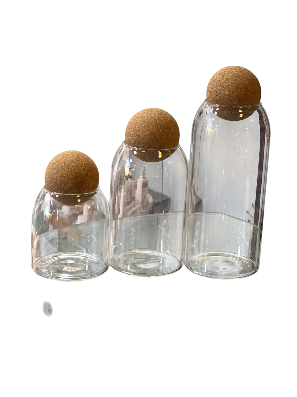 التصميم والوظيفة: يتيح التصميم البسيط والشفاف سهولة التعرف على المحتويات، ويتناسب مع مختلف أنماط ديكور المنزل. تُحكم كرة الفلين إغلاق المرطبان لمنع دخول الهواء والرطوبة، مما يساعد على الحفاظ على المواد الجافة طازجة لفترة أطول.