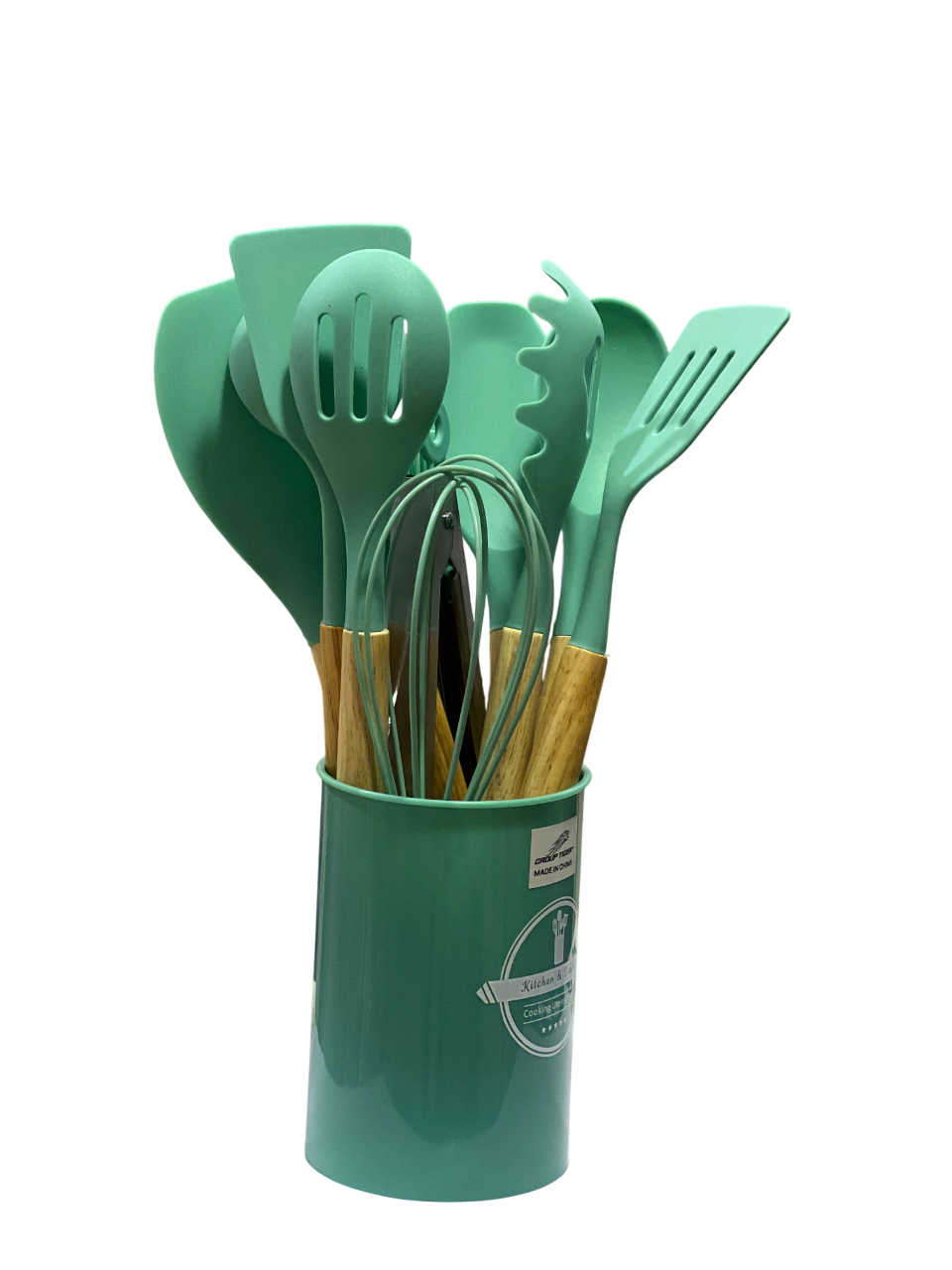 مجموعة أدوات مطبخ من السيليكون بمقابض خشبية، تتألف عادةً من 11 إلى 13 قطعة، محفوظة في علبة متناسقة.