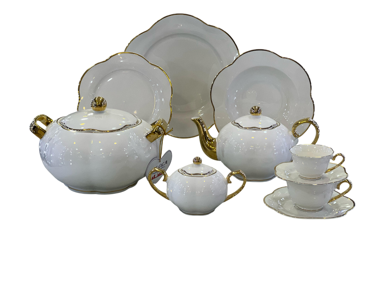 التصميم: يتميز الطقم بلمسة نهائية بيضاء راقية، مع حواف مزخرفة على شكل موجة على الأطباق، ولمسات ذهبية على جميع القطع. كما أن مقابض فناجين الشاي، والوعاء، وإبريق الشاي مطلية باللون الذهبي.