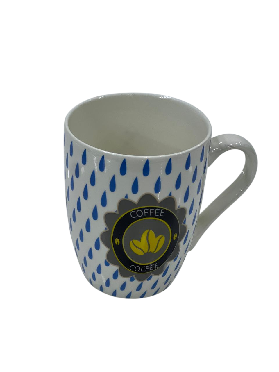 المج الظاهر في الصورة هو كوب قهوة سيراميك بتصميم زخرفي يتميز بنقش يشبه قطرات الماء الزرقاء وشعار مركزي للقهوة.