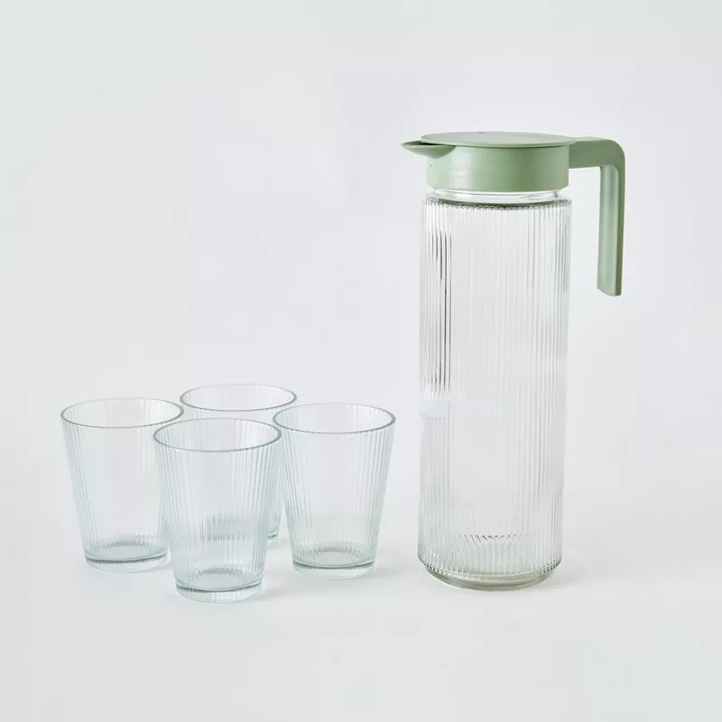 جزء من طقم أكواب زجاجية مضلعة مكون من 5 قطع، يتضمن إبريقًا طويلًا بغطاء ومقبض أخضرين، وأربعة أكواب متناسقة.