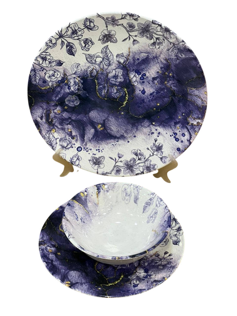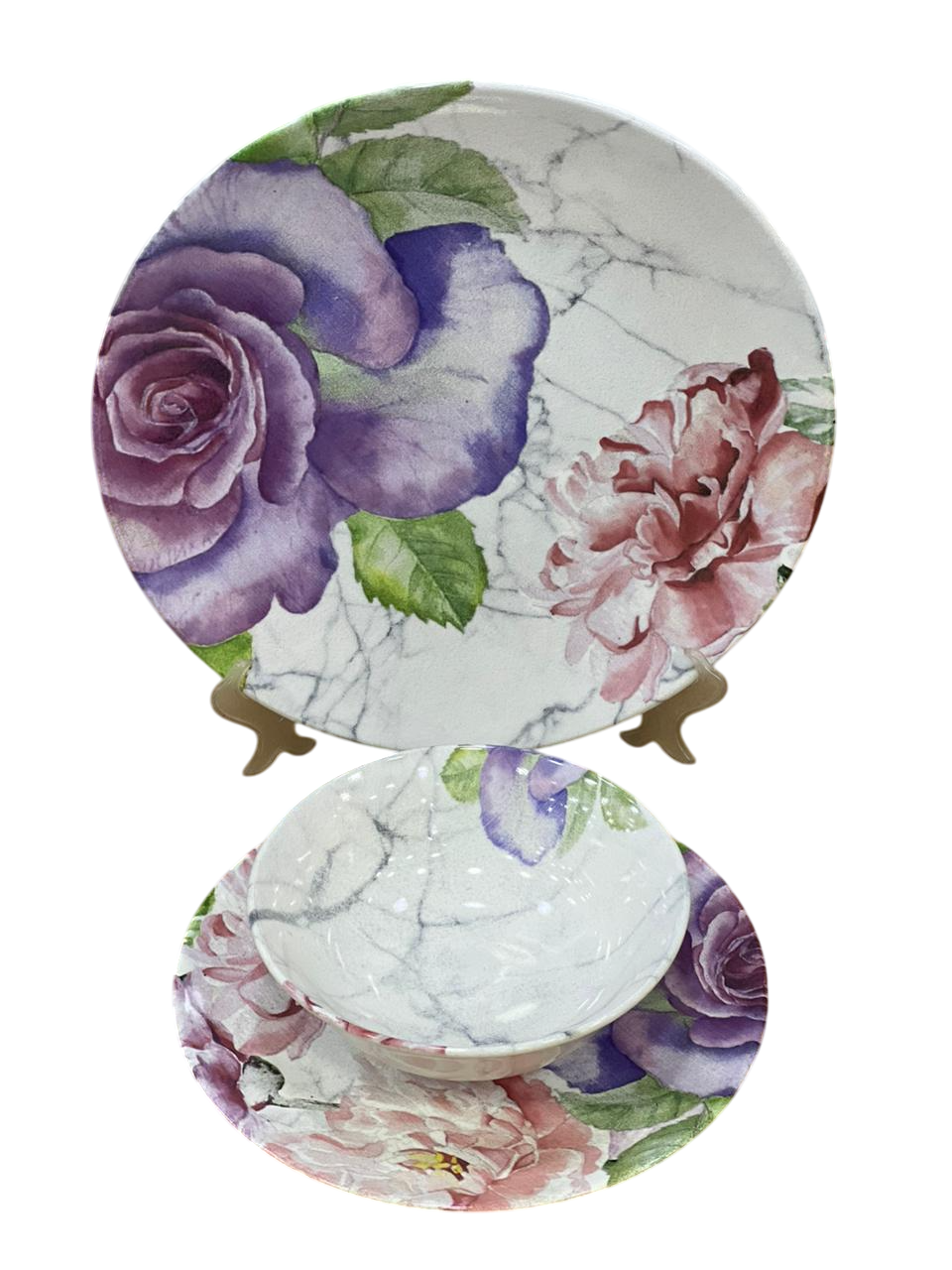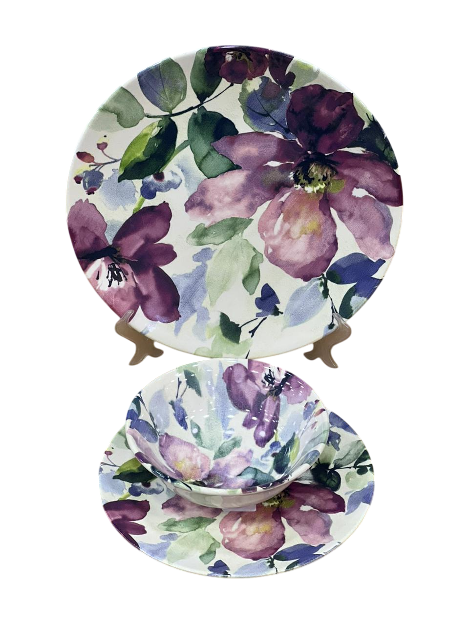 التصميم: يتميز التصميم بزخارف زهرية كبيرة وفنية باللون البنفسجي مع أوراق خضراء وزرقاء، تُشبه لوحة مائية. يتميز هذا النمط بالأناقة، وغالباً ما يكون جزءاً من طقم مائدة كامل، يشمل طبق عشاء، وطبق سلطة، ووعاء، وكوب.