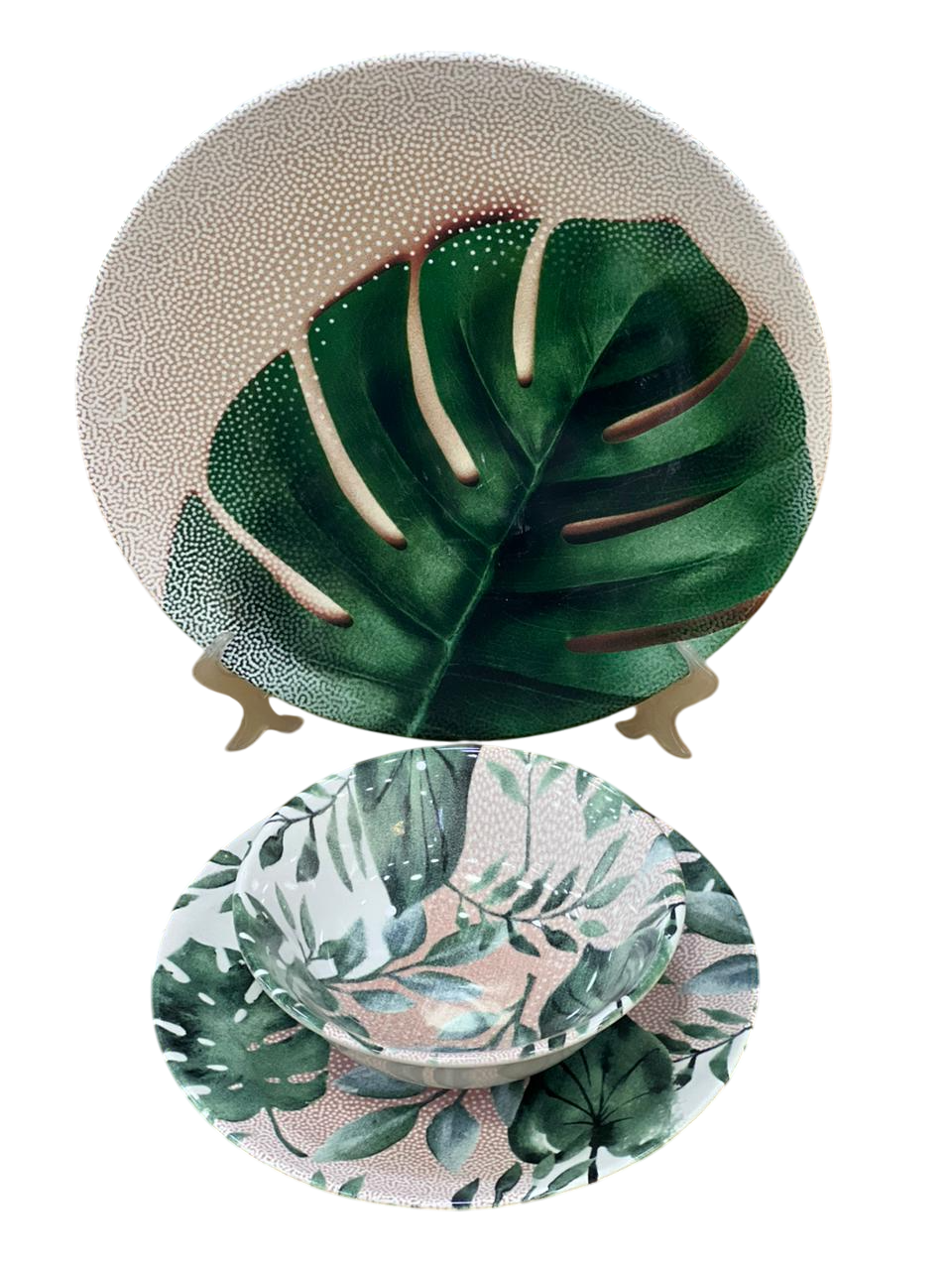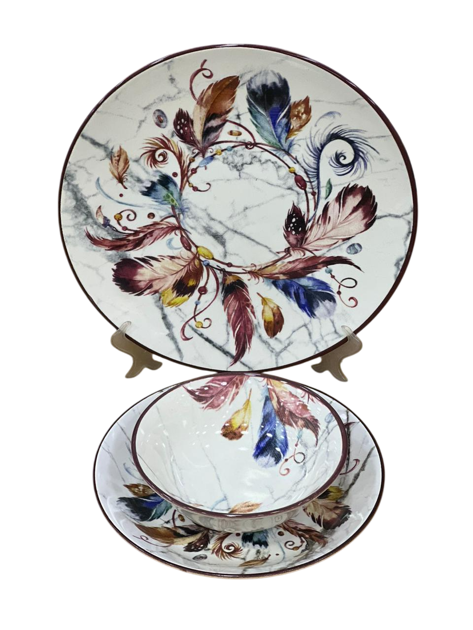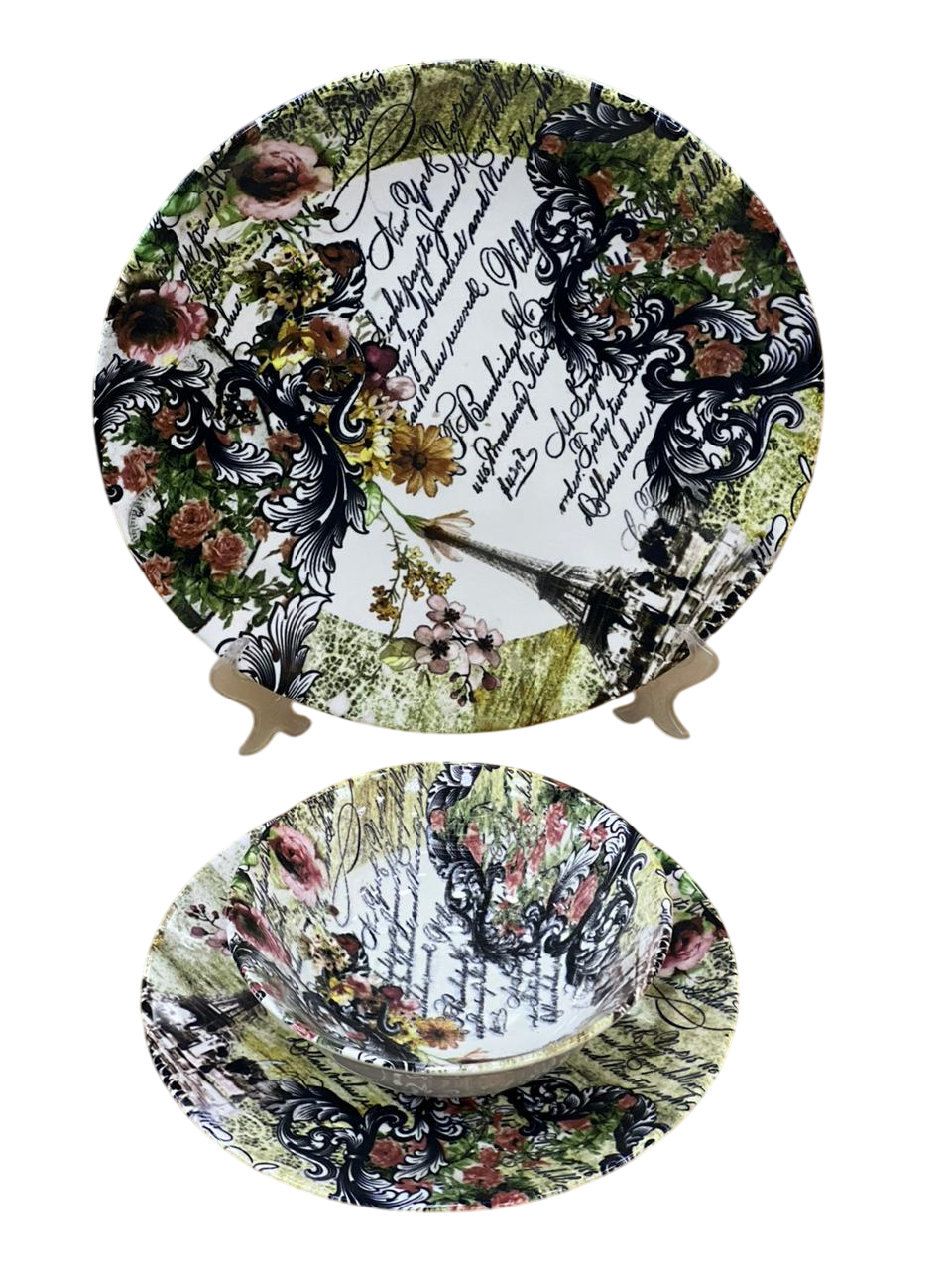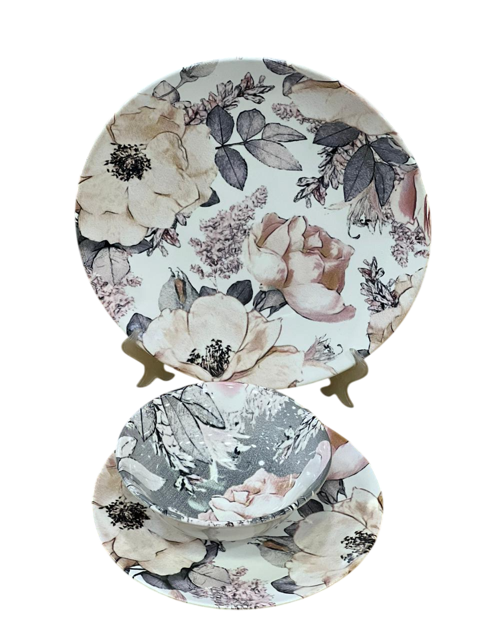 التصميم: يتميز التصميم بزخارف زهرية كبيرة وفنية باللون البنفسجي مع أوراق خضراء وزرقاء، تُشبه لوحة مائية. يتميز هذا النمط بالأناقة، وغالباً ما يكون جزءاً من طقم مائدة كامل، يشمل طبق عشاء، وطبق سلطة، ووعاء، وكوب.