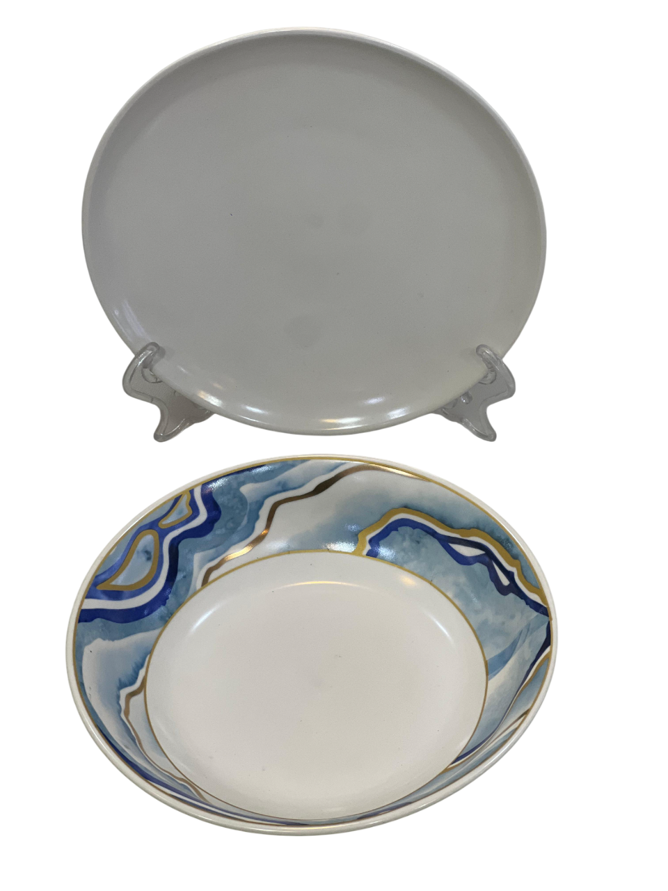 مجموعة أدوات مائدة بتصميم مستوحى من العقيق أو الرخام باللونين الأزرق والرمادي مع لمسات ذهبية. هذا النمط شائع في أطقم أدوات المائدة، ويُشار إليه غالبًا باسم “أطباق العقيق” أو “أطباق السحابة الزرقاء”.