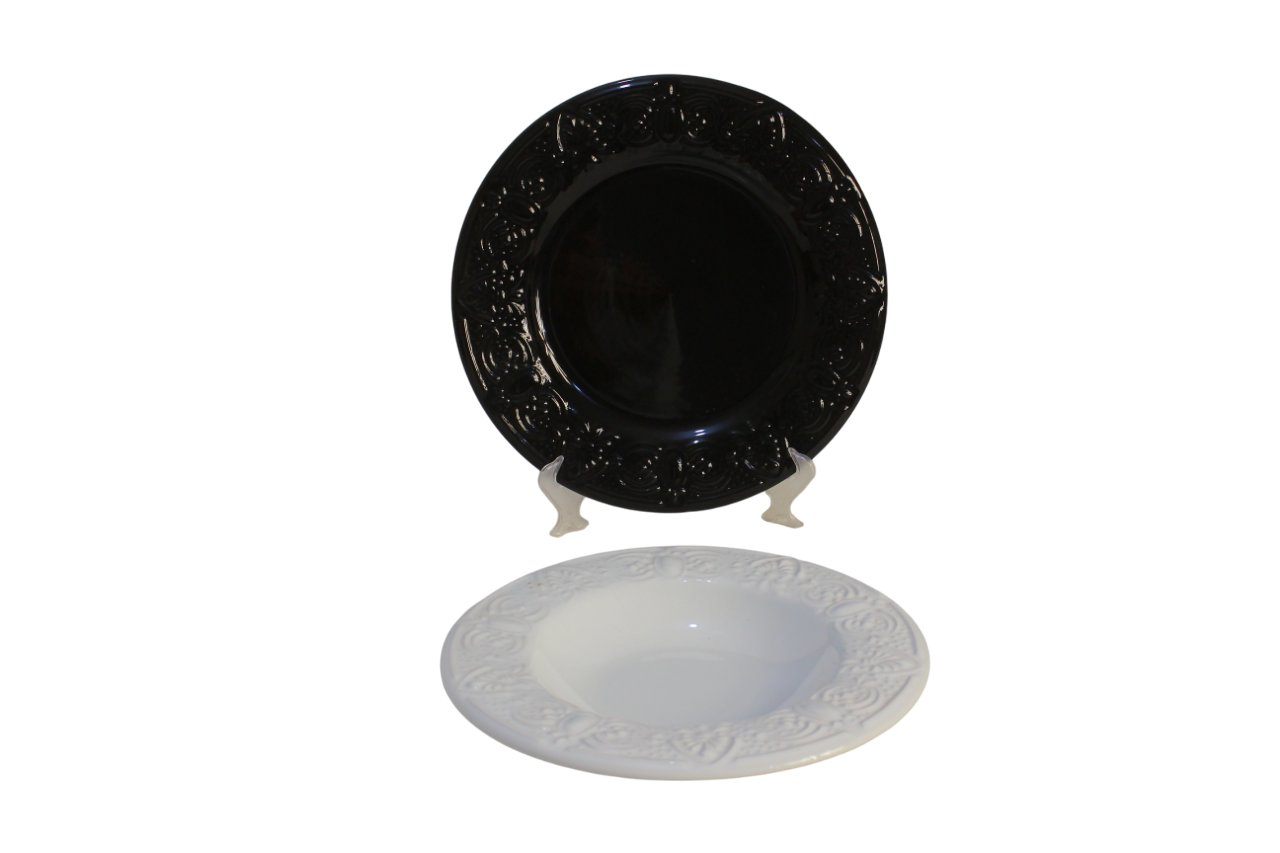 التصميم: يتميز كلا الطبقين بنفس النقش البارز والمعقد من الزخارف والأوراق والزهور حول الحافة. الطبق العلوي أحمر اللون ويبدو كطبق تقديم أو طبق عشاء، بينما الطبق السفلي أبيض اللون ويُستخدم كوعاء للشوربة أو المعكرونة.