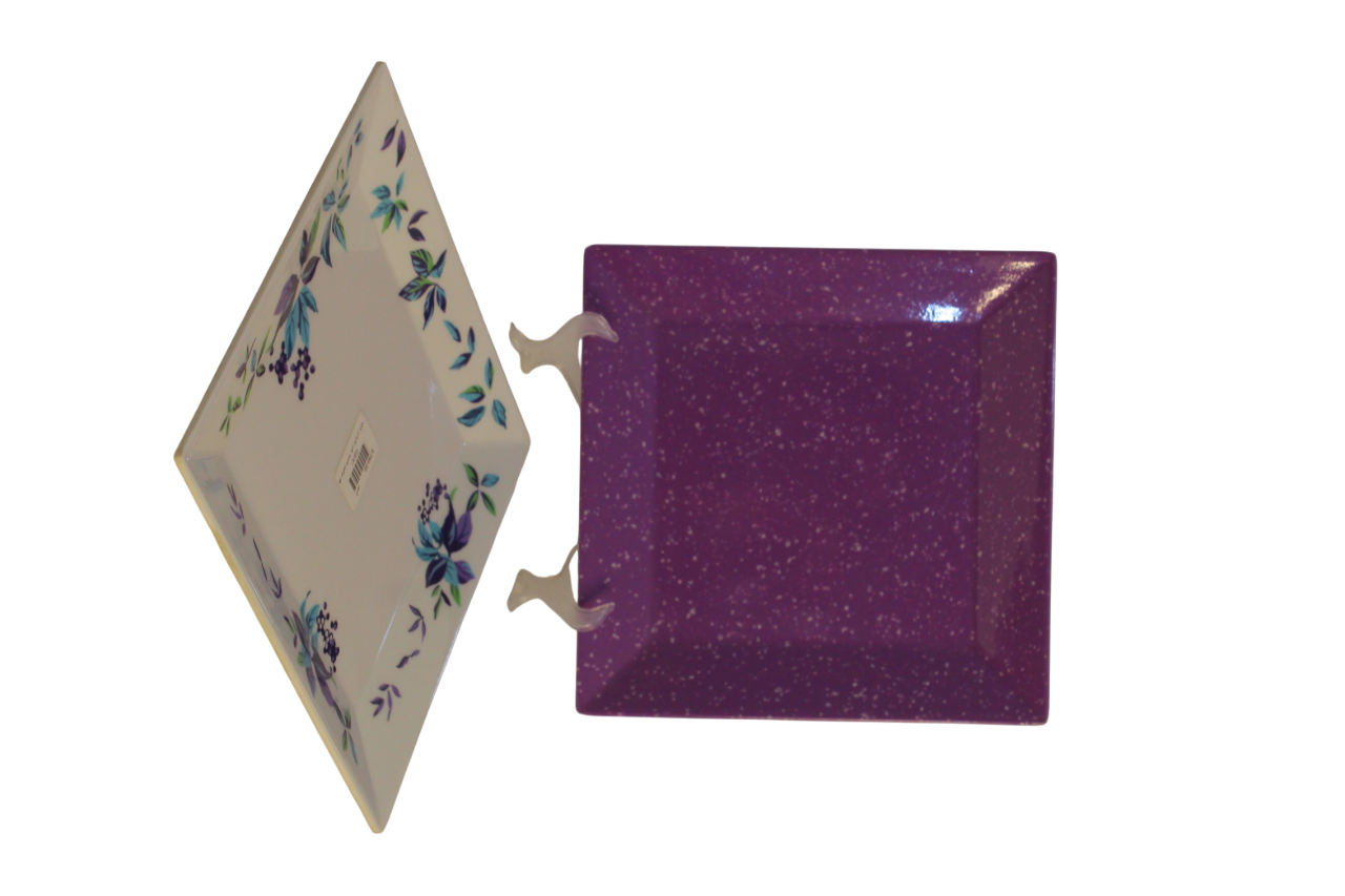 أطباق عشاء مربعة من الميلامين بتصاميم متناسقة. الطبق الأبيض مزين بنقوش زهرية باللونين البنفسجي والأخضر، أما الطبق البنفسجي فهو بلون موحد مرقط بنقاط بيضاء صغيرة، وهو تصميم شائع في أطقم العشاء الكبيرة.