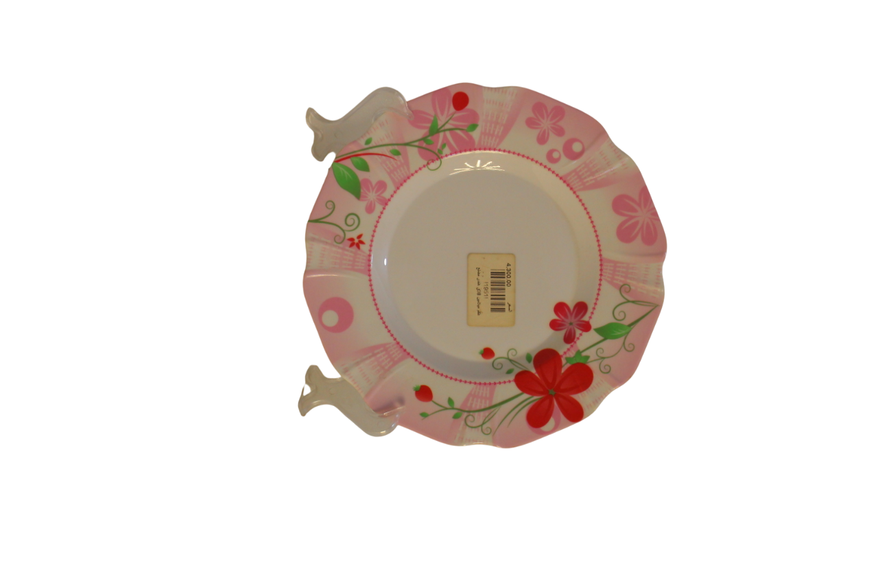 هذا الطبق مصنوع من مادة الميلامين، ويتميز بتصميم زهري نابض بالحياة باللونين الأحمر والوردي مع مركز أبيض وحواف مزخرفة. تشتهر هذه الأطباق بمتانتها، وغالبًا ما تُباع ضمن أطقم عشاء متكاملة.