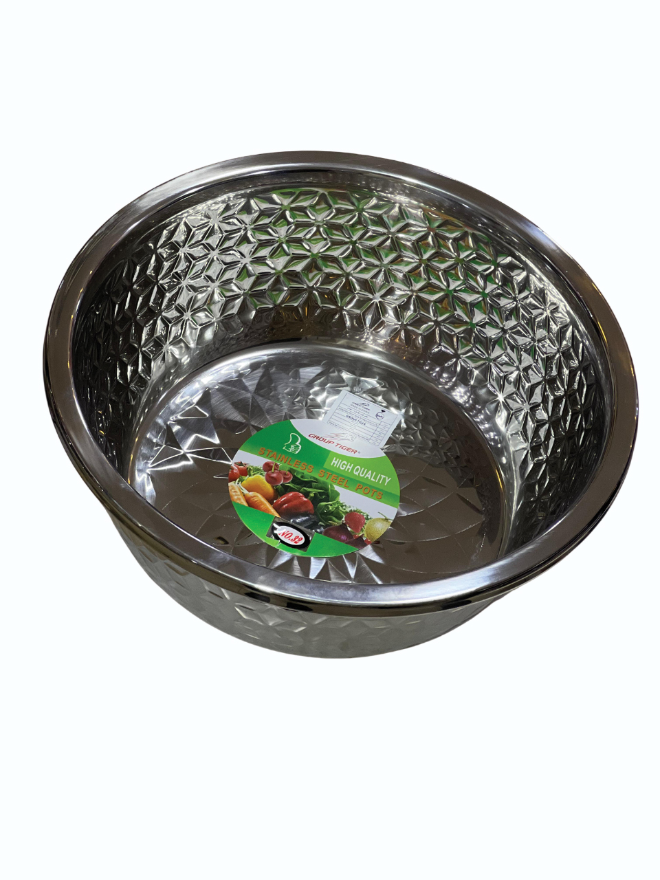 هذا وعاء عجان أو خلط مصنوع من الفولاذ المقاوم للصدأ، يتميز بسطحه الخارجي المزخرف بنقوش مطروقة. تُعد هذه الأوعية متعددة الاستخدامات في المطبخ، حيث تُستخدم عادةً لتحضير العجين، وخلط السلطات، وغسل الفواكه والخضراوات.