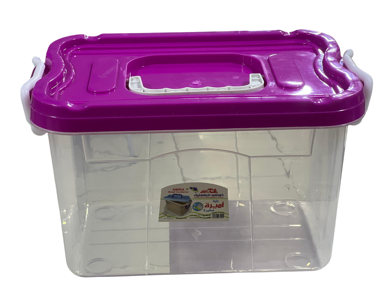 تُظهر الصورة صندوق تخزين بلاستيكي من أميرة، وهو منظم منزلي متعدد الاستخدامات. يتميز هذا الطراز تحديدًا بهيكل شفاف وغطاء بنفسجي زاهٍ ومقبض أبيض مدمج.