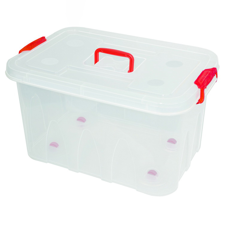 صندوق تخزين بلاستيكي شفاف بغطاء ومقابض/مزالج حمراء محكمة الإغلاق. الميزات الرئيسية والاستخدام