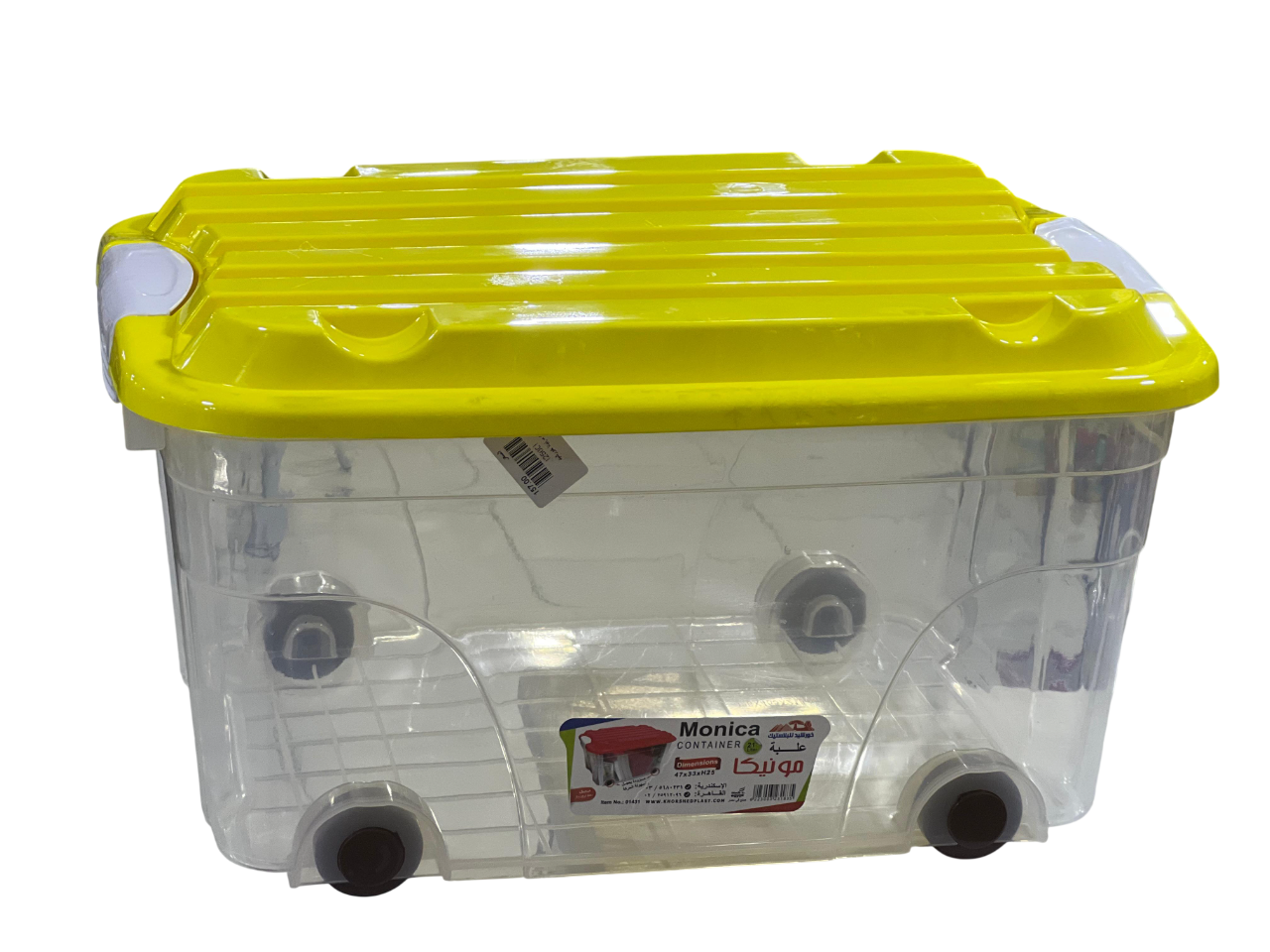 تُظهر الصورة صندوق تخزين مونيكا البلاستيكي. صُمم هذا الصندوق الشفاف لتخزين الأغراض المنزلية الثقيلة، ويأتي بغطاء أصفر زاهٍ.