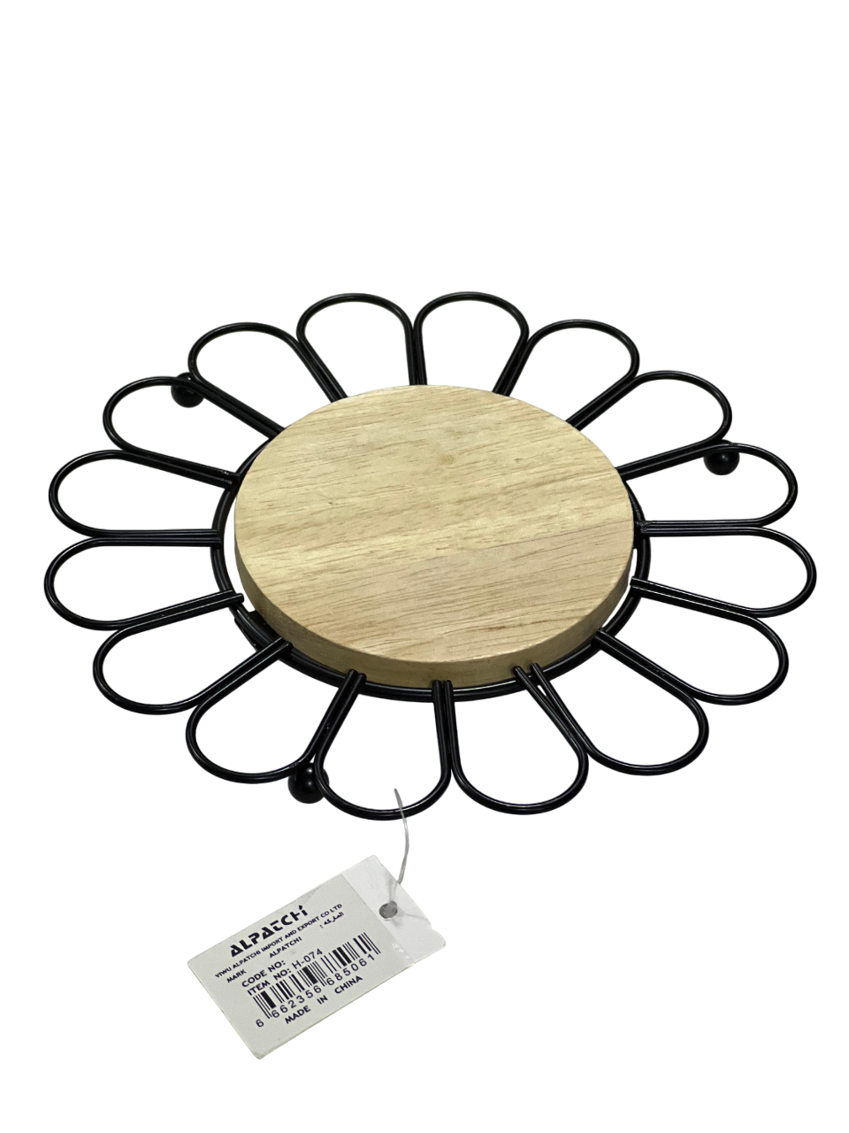 قاعدة تقديم أو حامل أواني مزخرف بإطار معدني أسود مع قطعة خشبية دائرية في المنتصف. يمكن استخدامه كرف لحماية الأسطح من الحرارة أو كصينية تقديم صغيرة.
