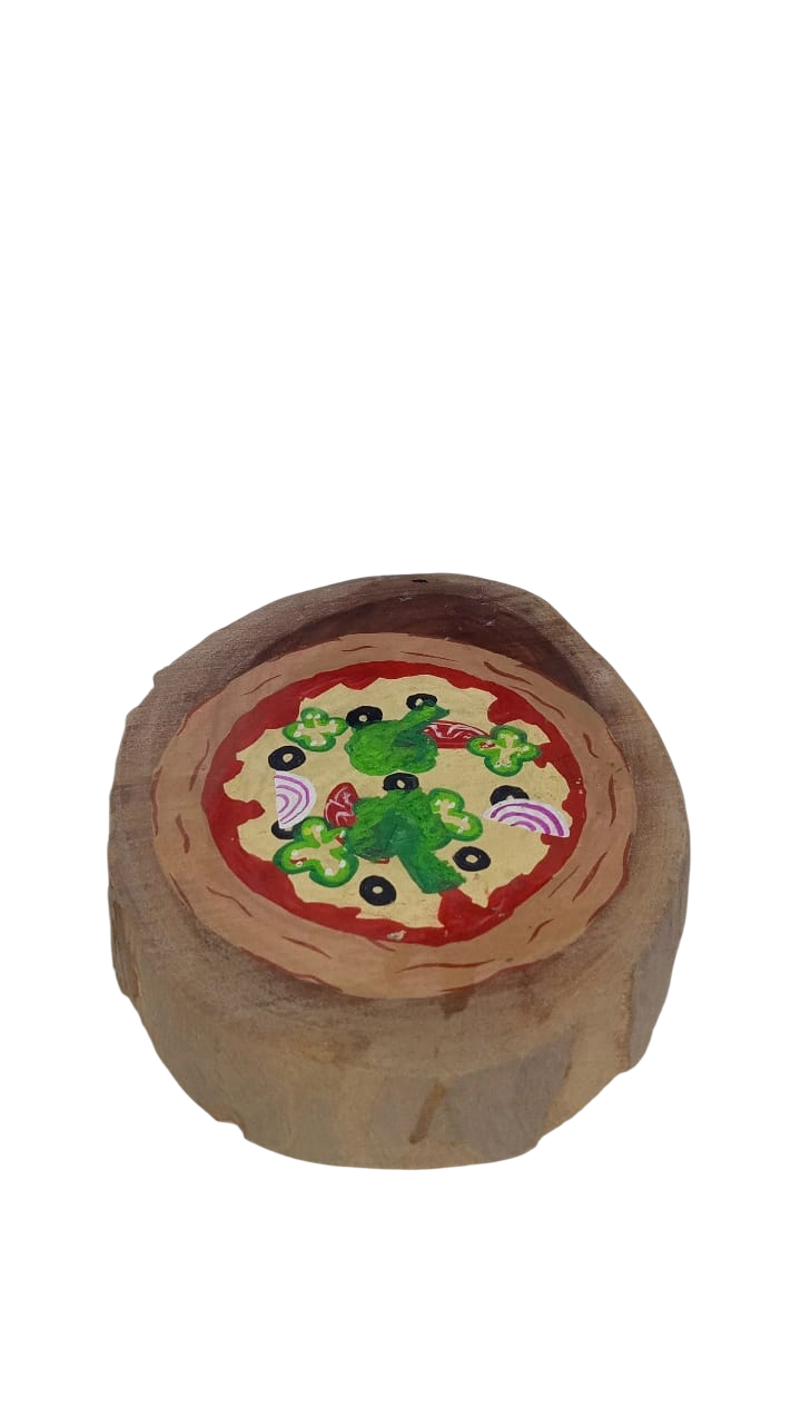المادة: قاعدة من شريحة خشبية طبيعية صغيرة، لا يزال لحاؤها سليمًا حول الحواف. تبدو البيتزا نفسها وكأنها مرسومة مباشرةً على الخشب أو على طبقة من الطين/الفوم باستخدام طلاء أكريليك أو طلاء مشابه.