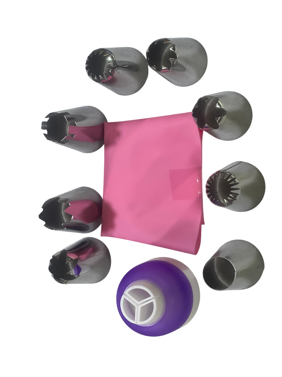 تحتوي هذه المجموعة على تشكيلة من رؤوس التزيين الروسية المصنوعة من الفولاذ المقاوم للصدأ، وكيس تزيين وردي اللون قابل لإعادة الاستخدام مصنوع من السيليكون، ووصلة بلاستيكية. هذه أدوات تزيين الكيك والكب كيك مصممة لإنشاء أزهار وتصاميم معقدة من كريمة الزبدة بضغطة واحدة على كيس التزيين.