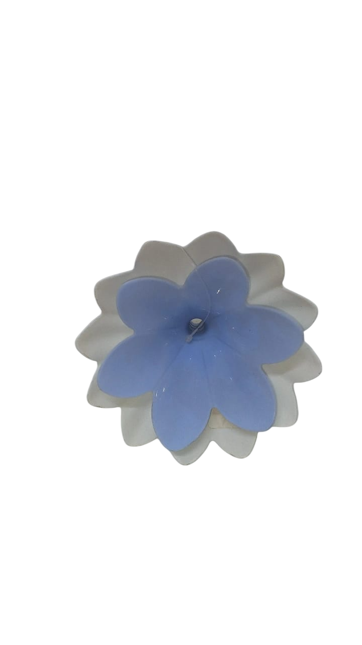 الشكل: يتميز بتصميم زهرة مزدوج الطبقات، حيث تكون الطبقة العلوية باللون الأزرق الفاتح والطبقة السفلية باللون الأبيض أو الشفاف.