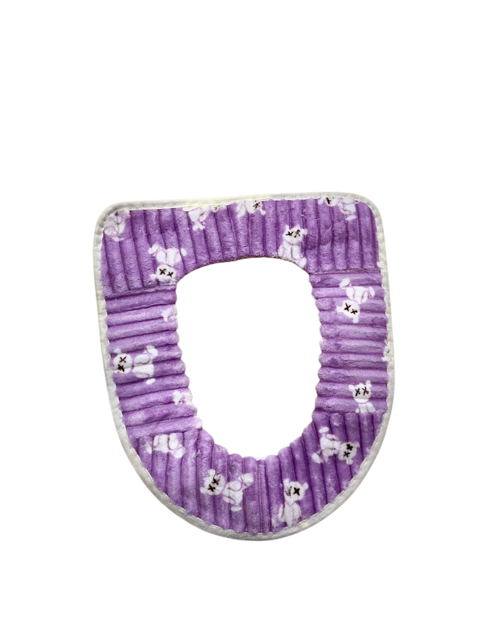 تُظهر الصورة غطاءً فاخرًا لمقعد المرحاض، يُعرف أيضًا باسم وسادة أو مدفئ مقعد المرحاض. هذا الطراز تحديدًا بنفسجي اللون، ذو ملمس مُضلّع يُشبه قماش الكوردروي، ومُزيّن بنقوش دببة بيضاء. صُممت هذه الأغطية في الأساس لتوفير الدفء والراحة، خاصةً خلال الأشهر الباردة.