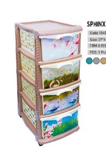 وحدة تخزين بلاستيكية بأربعة أدراج، كما هو موضح في النص. تتميز بإطار بني فاتح أو بيج وأدراج مزينة بنقوش زهرية ملونة على الألواح الأمامية.