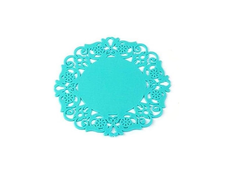التصميم: مفرش دائري صغير بلون “تيل” (أزرق مخضر) يتميز بنقوش مفرغة معقدة تشبه الدانتيل.