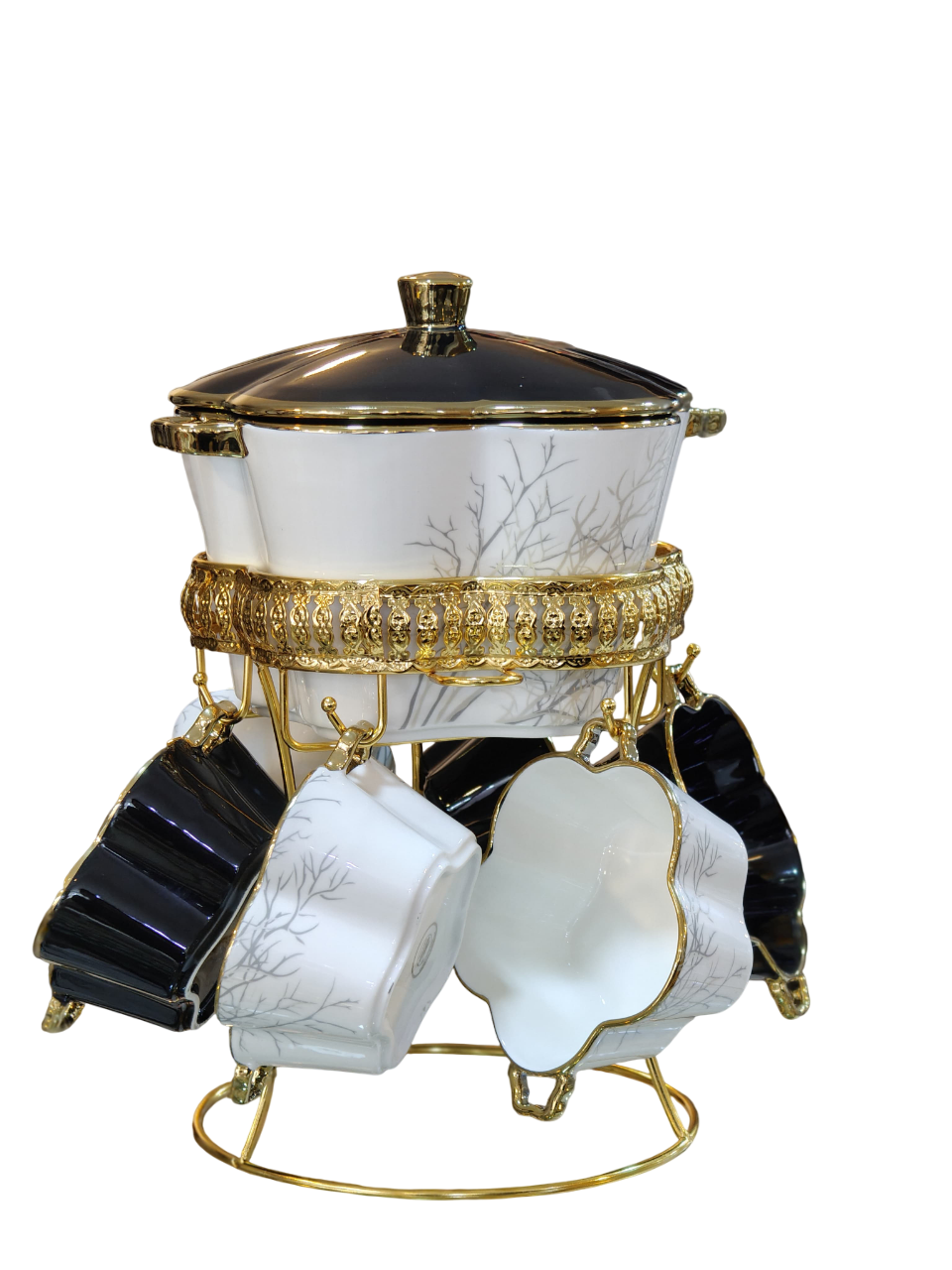 التصميم: يتميز بجمالية عصرية مع ألوان ثنائية (أسود وأبيض) ولمسات مطلية بالذهب على الغطاء والقاعدة والمقابض.