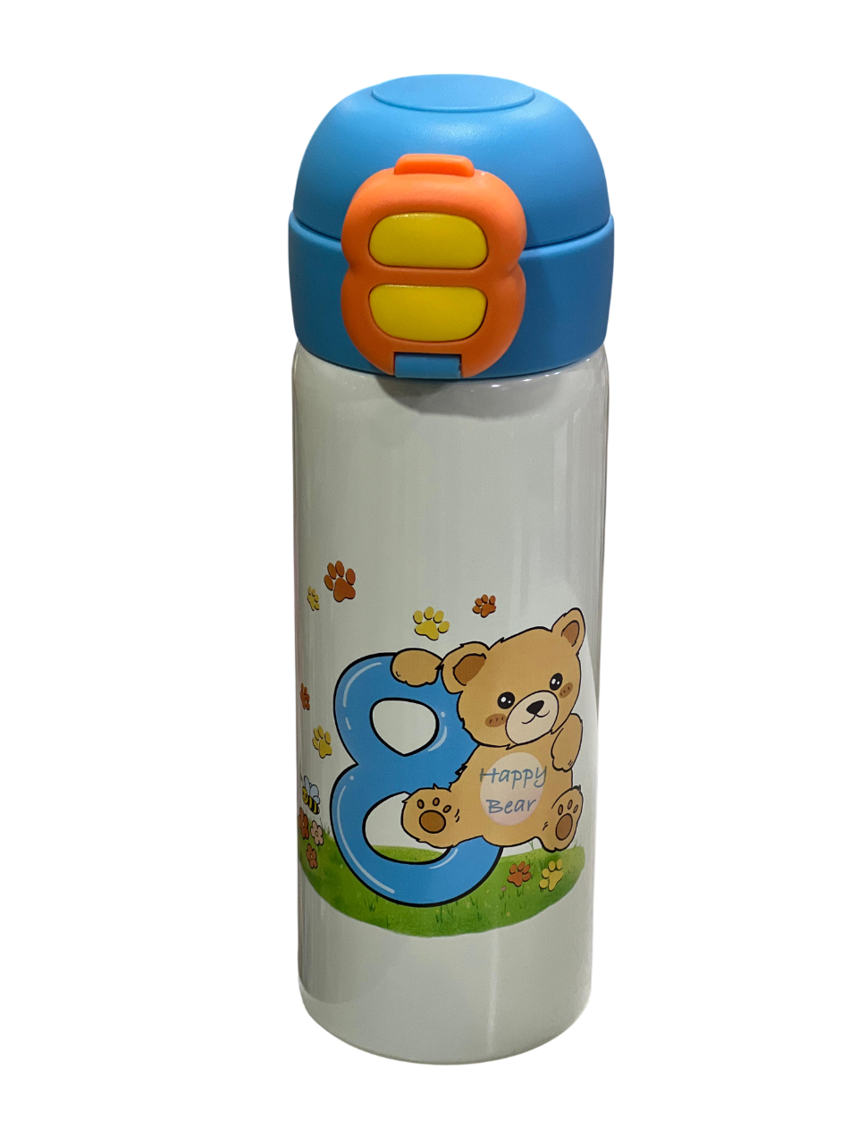 هذه زجاجة سفر للأطفال، معزولة بتفريغ الهواء، تُعرف باسم ترمس “الدب السعيد”. تتميز بتصميم مزدوج الجدار من الفولاذ المقاوم للصدأ، مصمم للحفاظ على درجة حرارة المشروبات الساخنة والباردة لعدة ساعات.