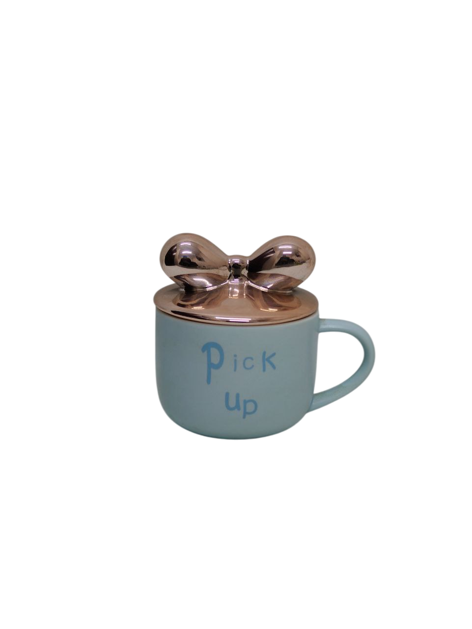 كوب سيراميك بغطاء مميز لامع على شكل قوس. يحمل عبارة “Pick up” مكتوبة على جانبه، وهو مصمم للشاي أو القهوة.