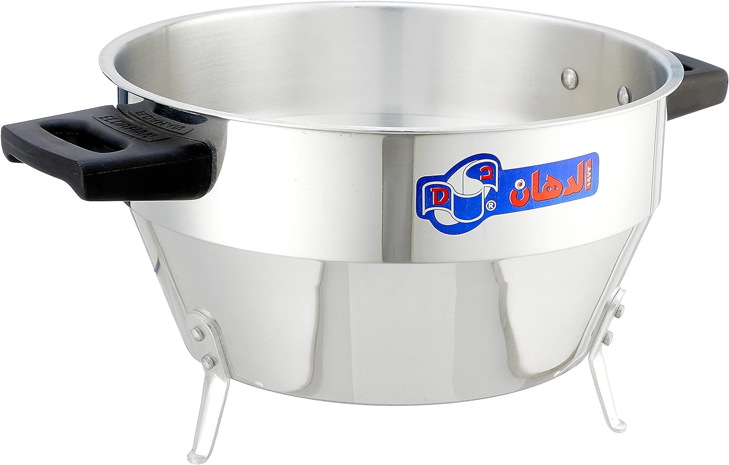 التصميم: تتميز بقاعدة دائرية وثلاث أرجل قصيرة لرفعها عن السطح، مما يسمح بتصريف الماء بشكل صحيح. مزودة بمقابض سوداء من الباكليت المقاوم للحرارة لضمان إمساك محكم.
