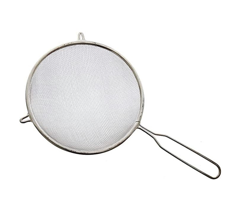 يظهر في الصورة مصفاة شبكية من الستانلس ستيل ، وهي أداة مطبخ أساسية ومتعددة الاستخدامات.